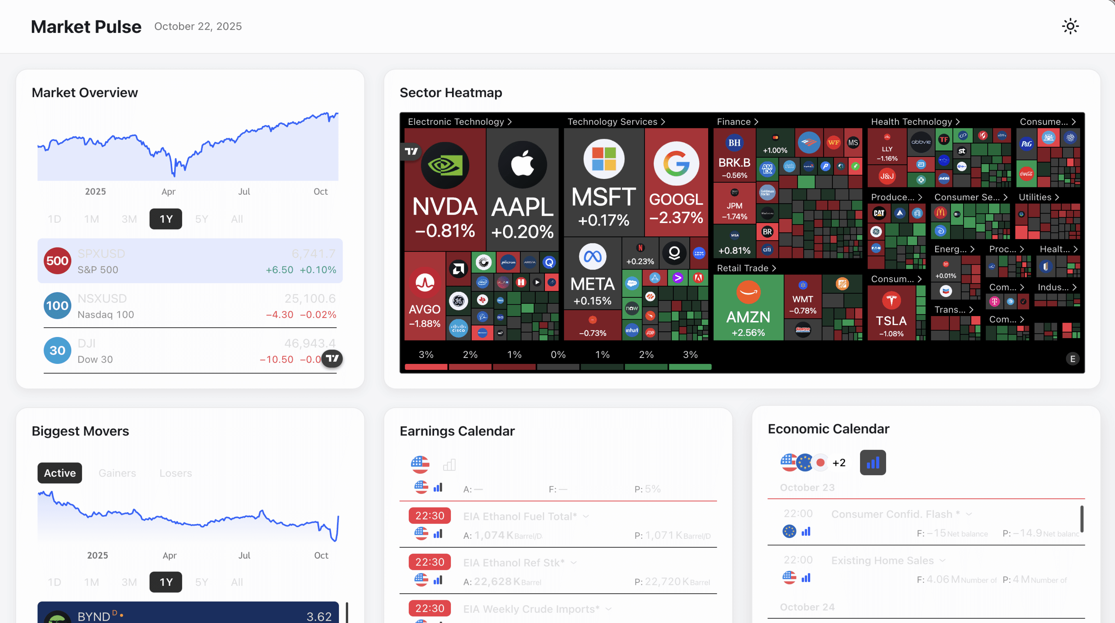 The development of the Market Pulse financial dashboard homepage is complete. The application is now live and fully operational, providing a comprehensive, client-side solution for real-time market monitoring.